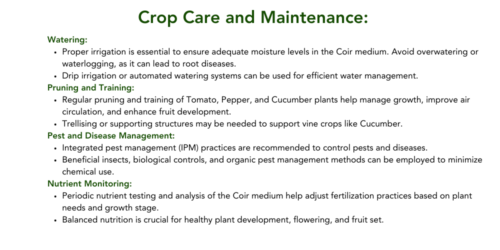 Use water-soluble fertilizers suitable for hydroponic and soilless growing systems. Follow manufacturer's recommendations for fertilizer rates, dilution ratios, and application frequencies. Monitor EC (electrical conductivity) and pH levels of the fertigation solution regularly to maintain optimal nutrient uptake and Coir medium conditions. Adjust fertigation schedules based on environmental factors, plant growth stage, and crop nutrient requirements. Incorporate organic fertilizers or supplements as needed to enhance soil health and microbial activity in the Coir medium.