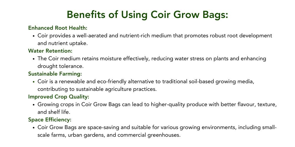 Sustainable and Biodegradable: Coir grow bags are eco-friendly alternatives as they are made from renewable coconut fibers and decompose naturally over time.